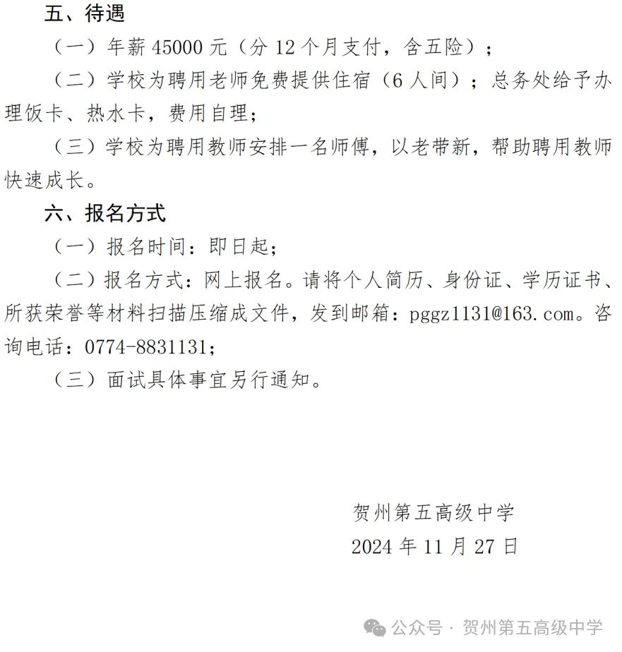 賀州第五高級中學2024年秋季學期招聘教師公告