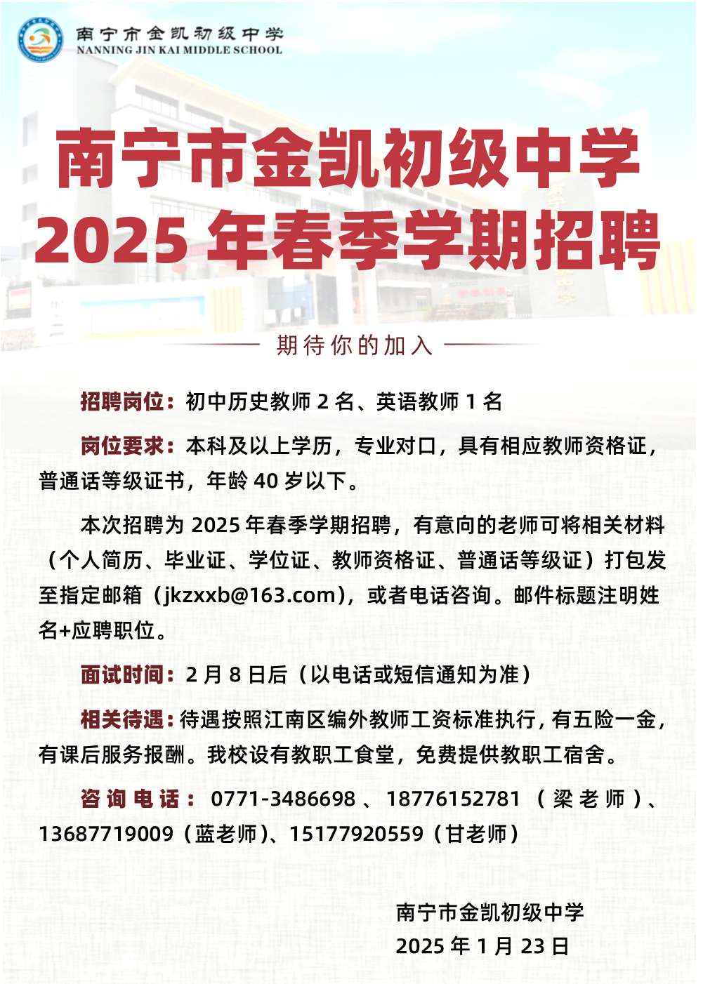 2025年南寧市金凱初級(jí)中學(xué)誠聘歷史、英語教師