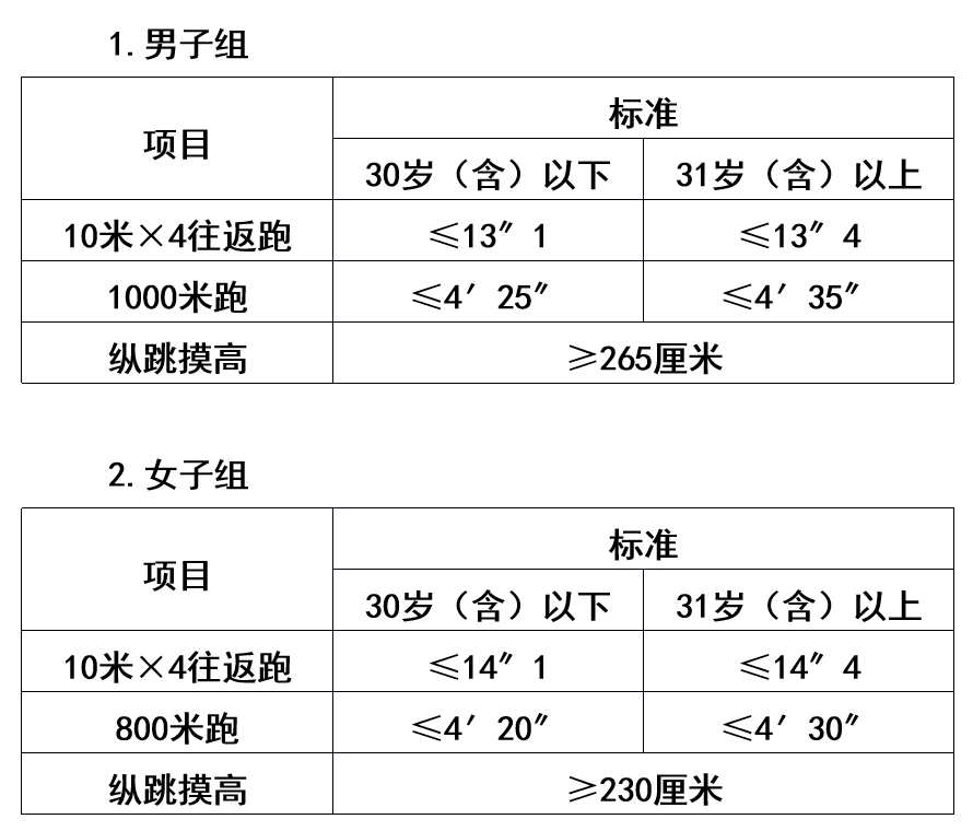 體能測評的項(xiàng)目和標(biāo)準(zhǔn)按照《關(guān)于印發(fā)〈公安機(jī)關(guān)錄用人民警察體能測評項(xiàng)目和標(biāo)準(zhǔn)〉的通知》(公政治〔2024〕60號)執(zhí)行,其中綜合管理類、執(zhí)法勤務(wù)類職位測查全部3個項(xiàng)目,警務(wù)技術(shù)類職位免予測查1000米(男)/800米(女)跑項(xiàng)目。對于專業(yè)人才緊缺難以形成競爭的特殊職位(緊缺職位),體能測評三項(xiàng)中有兩項(xiàng)達(dá)標(biāo)的,視為合格。凡應(yīng)測項(xiàng)目中任意一項(xiàng)不達(dá)標(biāo)的,即為體能測評不合格。具體如下: