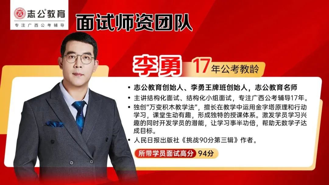 李勇——志公教育創(chuàng)始人、李勇王牌®班創(chuàng)始人,志公教育名師。主講結(jié)構(gòu)化面試、結(jié)構(gòu)化小組面試,專注廣西公考輔導(dǎo)17年。獨(dú)創(chuàng)“萬(wàn)變積木教學(xué)法”,擅長(zhǎng)在教學(xué)中運(yùn)用金字塔原理和行動(dòng)學(xué)習(xí),課堂生動(dòng)有趣,形成獨(dú)特的授課體系。激發(fā)學(xué)員學(xué)習(xí)興趣的同時(shí)開發(fā)學(xué)員的潛能,讓學(xué)習(xí)事半功倍,幫助無(wú)數(shù)學(xué)子達(dá)成目標(biāo)。同時(shí)也是人民日?qǐng)?bào)出版社《挑戰(zhàn)90分第三輯》作者。