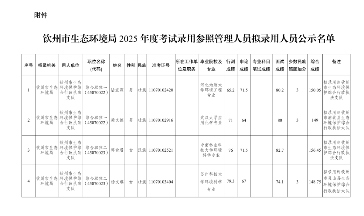 附件:欽州市生態(tài)環(huán)境局2025年度考試錄用參照管理人員擬錄用人員名單