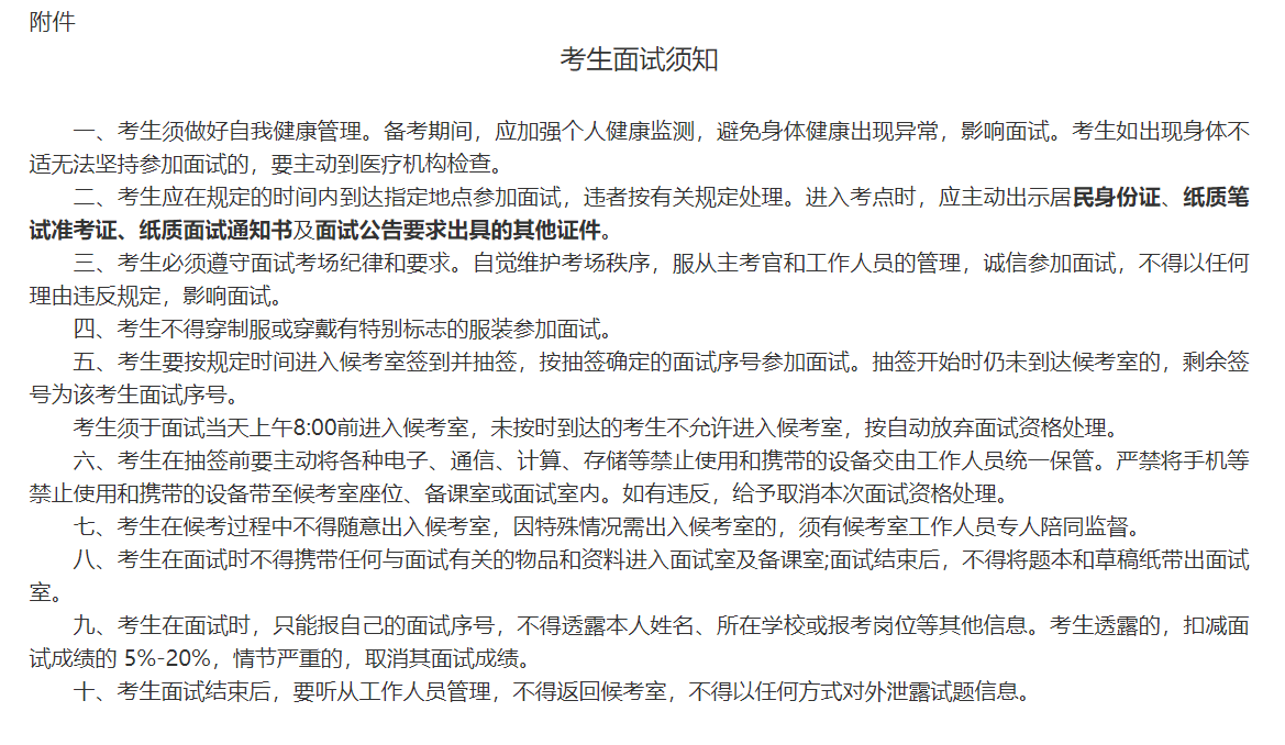 (二)考生持本人有效居民身份證原件(臨時(shí)身份證及派出所出具的身份證明同等有效)、紙質(zhì)筆試準(zhǔn)考證及面試通知書(shū)原件參加面試。