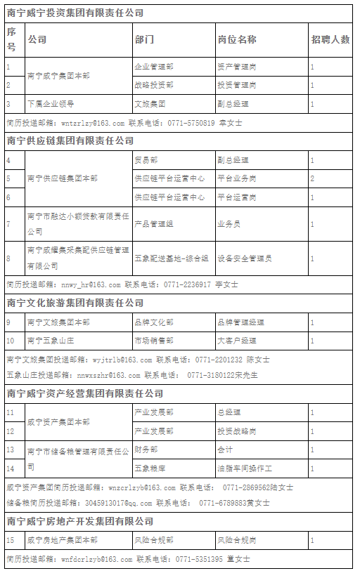 南寧威寧投資集團有限責任公司現(xiàn)因集團業(yè)務高速發(fā)展需要,集團本部及各下屬企業(yè)誠邀各類優(yōu)秀人才加盟,公司將提供完善的激勵晉升機制及廣闊的發(fā)展空間。熱忱歡迎有志之士加盟,公司將為您提供完善的激勵晉升機制及廣闊的發(fā)展平臺,招聘崗位、人數(shù)及崗位要求詳見附件。