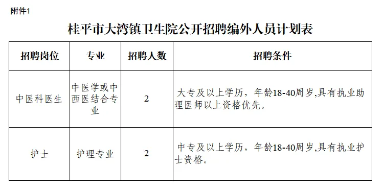 附件:1.桂平市大灣鎮(zhèn)衛(wèi)生院公開招聘編外工作人員計劃表