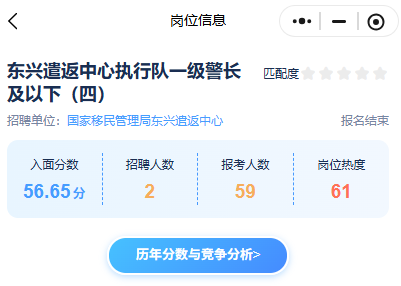 其中東興遣返中心執(zhí)行隊一級警長及以下(四)崗位歷年入面分為56.65分、報考人數(shù)為59人↓