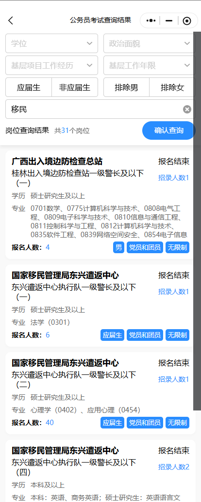 如駐廣西移民管理機構(gòu)崗位,在公考天眼輸入【移民】可查出2025年國考廣西崗位中,有31個崗位信息↓