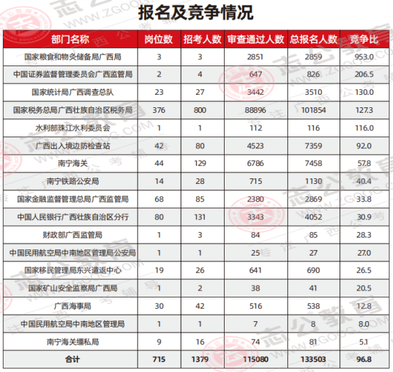 廣西海關系統(tǒng)總體:平均競爭比約為31:1,競爭熱度相對較低。