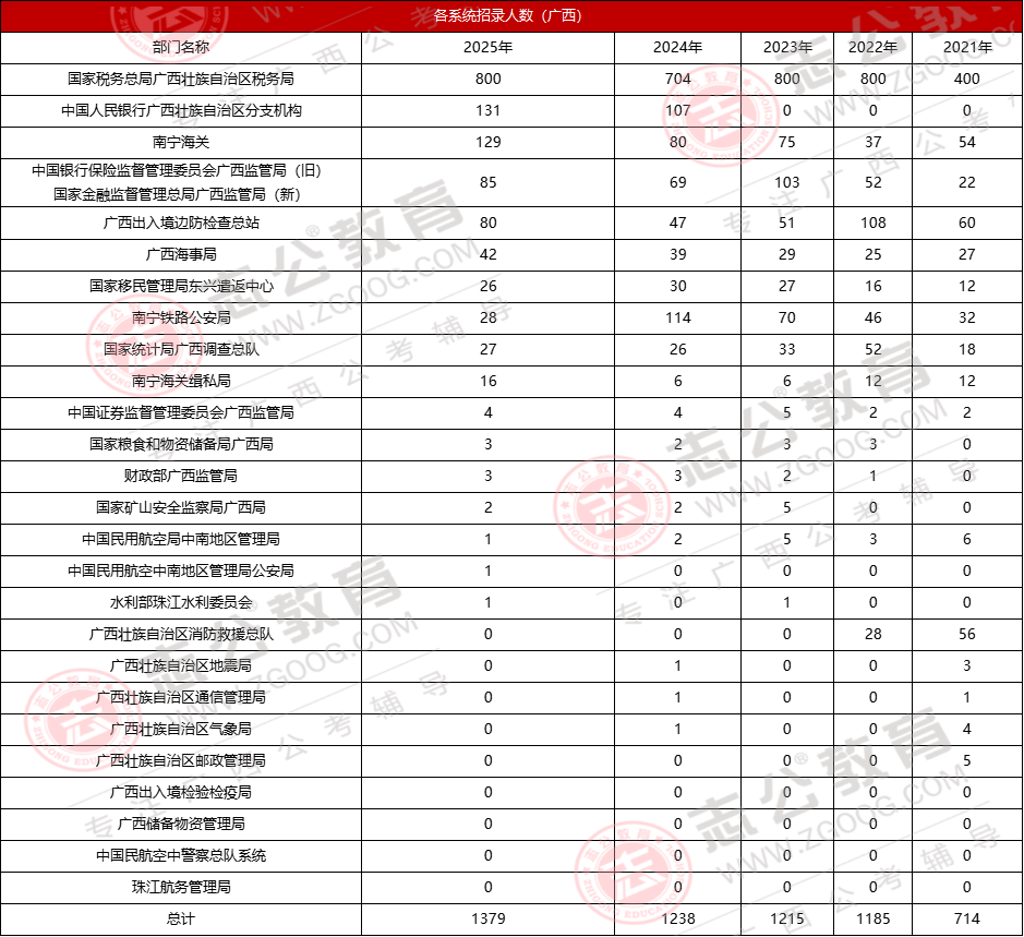 國家稅務總局廣西壯族自治區(qū)稅務局常年占據(jù)招錄首位,2025年以376個崗位、800人的招錄規(guī)模,占廣西總招錄人數(shù)的58%。此外,海關系統(tǒng)對廣西考生較為友好,平均入面分數(shù)約117分,比稅務系統(tǒng)低5分以上,且常面向冷門專業(yè)招錄,可作為特色選擇。