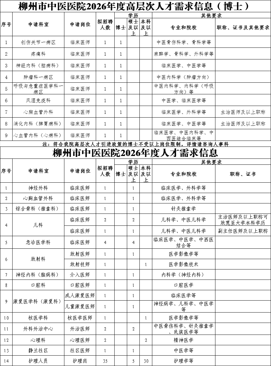 高層次人才不受招聘崗位限制,均可一事一議、一人一議。高層次人才(博士)根據醫(yī)院引進人才制度,給予25萬-120萬元安家費、5萬-20萬元科研啟動經費。引進的高層次人才(高級職稱或博士研究生)按柳州市有關政策提供事業(yè)編制,協(xié)助其解決子女入學和配偶工作。2026年醫(yī)學類緊缺人才擬招聘醫(yī)師7人,緊缺人才科室為心理科(精神衛(wèi)生專業(yè))、神經外科、急診醫(yī)學科,擬享受柳州市中醫(yī)醫(yī)院人才引進醫(yī)學類緊缺人才安家費2-20萬元,同時按照國家、廣西壯族自治區(qū)、柳州市及醫(yī)院有關政策享受工資及福利待遇,獎勵性績效工資按照醫(yī)院同級同類人員規(guī)定執(zhí)行。如為學科帶頭人或高層次人才則另按其標準享受相關待遇。