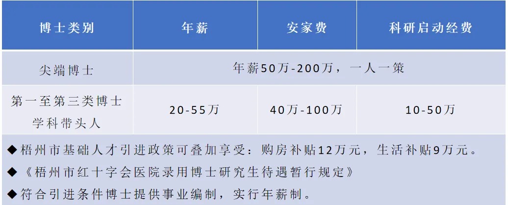 博士研究生學(xué)歷學(xué)位的急需緊缺專業(yè)人才:享受醫(yī)院引進(jìn)博士待遇20-200萬元/年,實行年薪制待遇一人一議,提供科研啟動經(jīng)費(fèi)10萬-50萬元,疊加享受梧州市人才引進(jìn)補(bǔ)助,安家費(fèi)52-125萬元,生活補(bǔ)貼9-12萬元。