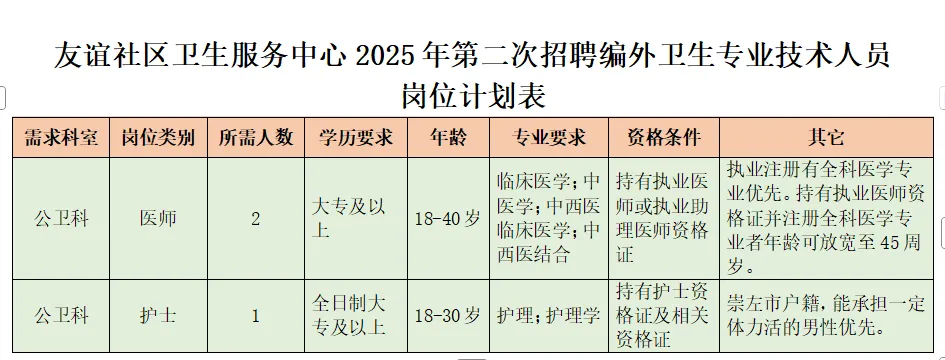 2025年崇左市江州區(qū)友誼社區(qū)衛(wèi)生服務(wù)中心公開(kāi)招聘編外聘用衛(wèi)生專(zhuān)業(yè)技術(shù)人員公告