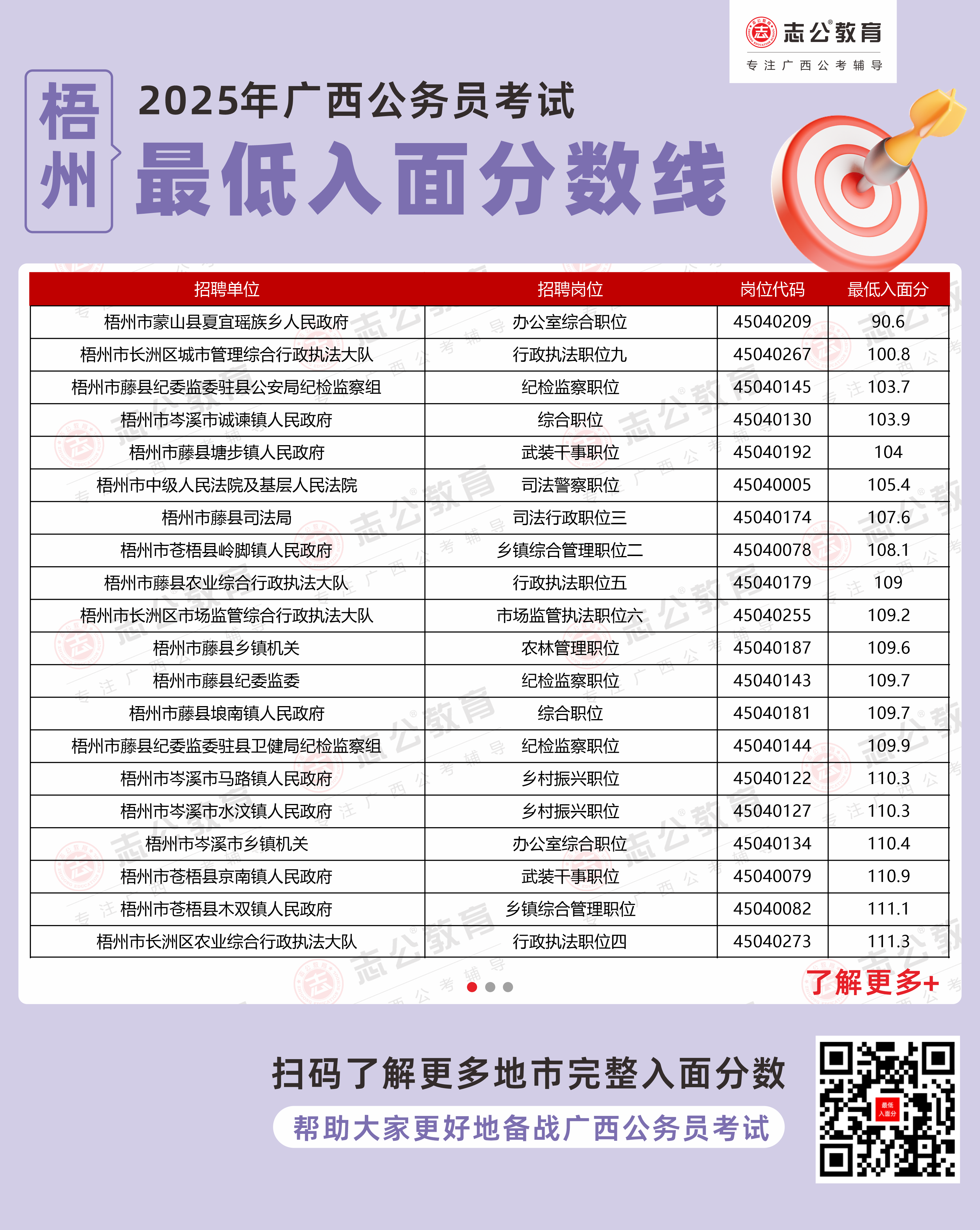 以下為志公教育根據(jù)官方發(fā)布的面試資格審查公告及公開數(shù)據(jù)整理的梧州市部分單位的進(jìn)面最低筆試分?jǐn)?shù)(含照顧加分),數(shù)據(jù)僅供參考,具體以官方實(shí)際公布為準(zhǔn)。