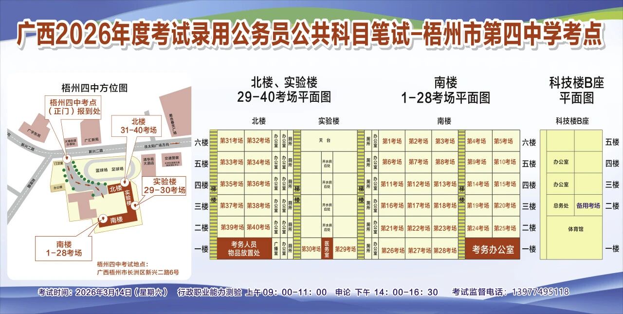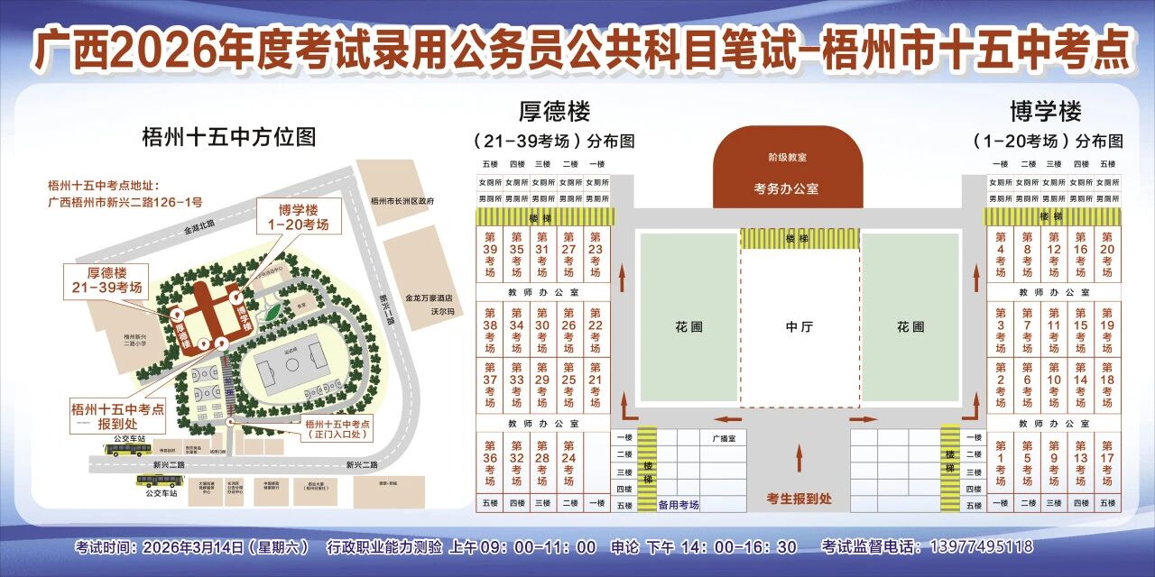 一、廣西2026年度考試錄用公務(wù)員(選調(diào)生)公共科目筆試將于3月14日舉行,梧州考區(qū)共設(shè)置10個(gè)考點(diǎn),請(qǐng)考生提前熟悉各自考點(diǎn)位置、周邊環(huán)境及交通情況,考試當(dāng)天提前出門做好準(zhǔn)備,準(zhǔn)時(shí)參加考試。